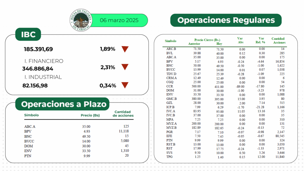 El índice principal de la Bolsa de Valores de Caracas, el IBC, culminó este jueves en 185.391,69 puntos con una variación de 3.573,98 puntos (-1,89%), con respecto a la sesión anterior.
