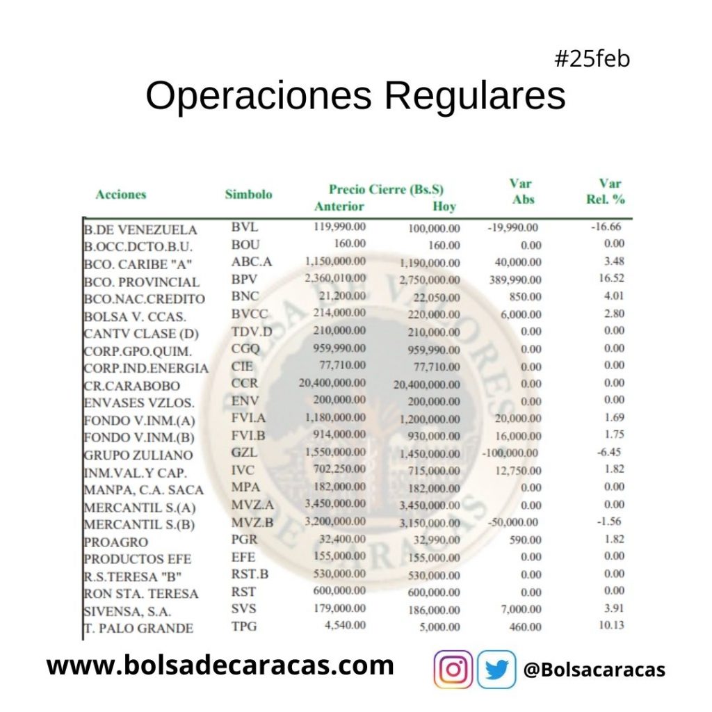 Se efectuaron 144 operaciones de compra/venta de acciones de las empresas inscritas en la pizarra de cotizaciones, en las cuales se transó 1 millón 318 mil 387 acciones por 107 mil 649 millones 701 mil 290 bolívares.