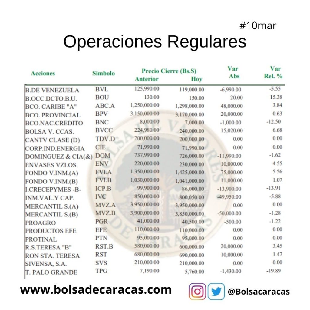 Se efectuaron 163 operaciones de compra/venta de acciones de las empresas inscritas en la pizarra de cotizaciones, en las cuales se transaron 151 mil 649 acciones por 50 mil 618 millones 089 mil 140 bolívares.