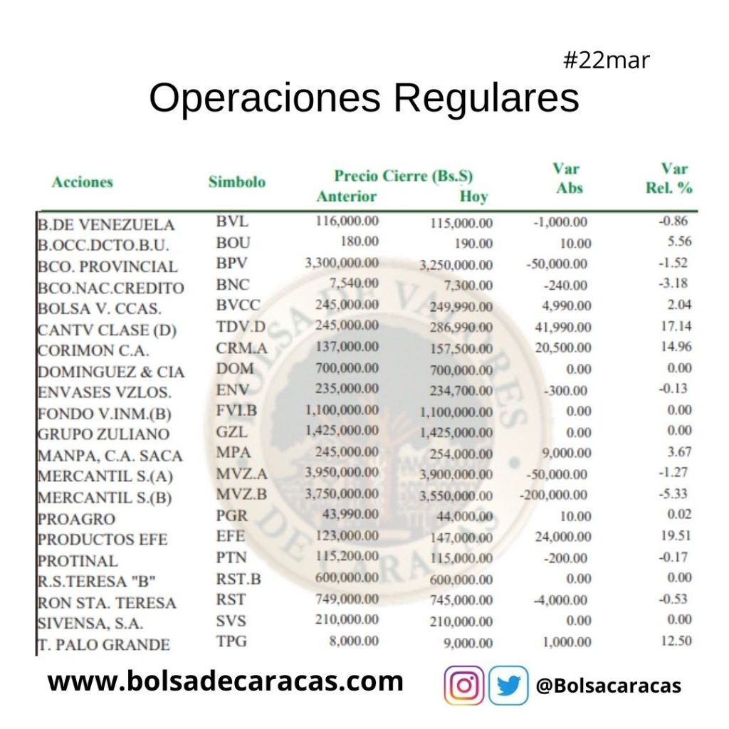 En el mercado a plazo se negociaron 998 mil 433 acciones por un monto de 40 mil 385 millones 406 mil 350 bolívares.
