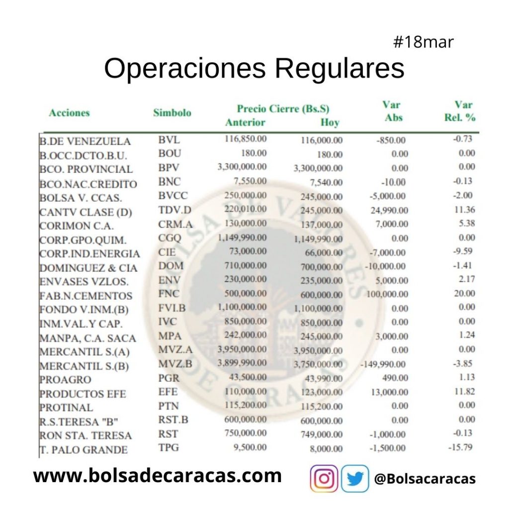 En el mercado a plazo se negociaron 389 mil 701 acciones por un monto de 98 mil 290 millones 421 mil 470 bolívares.