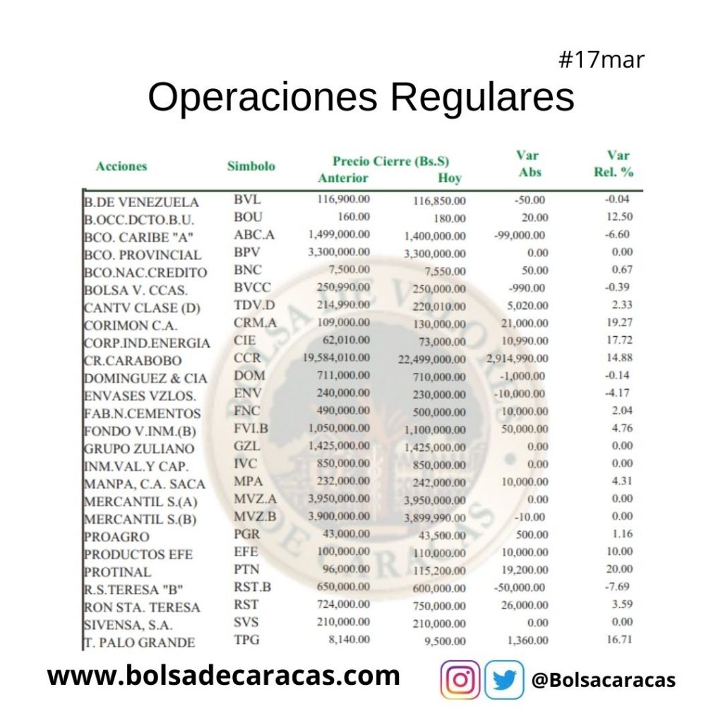 Se efectuaron 205 operaciones de compra/venta de acciones de las empresas inscritas en la pizarra de cotizaciones, en las cuales se transó un millón 066 mil 592 acciones por 41 mil 530 millones 465 mil 650 bolívares.