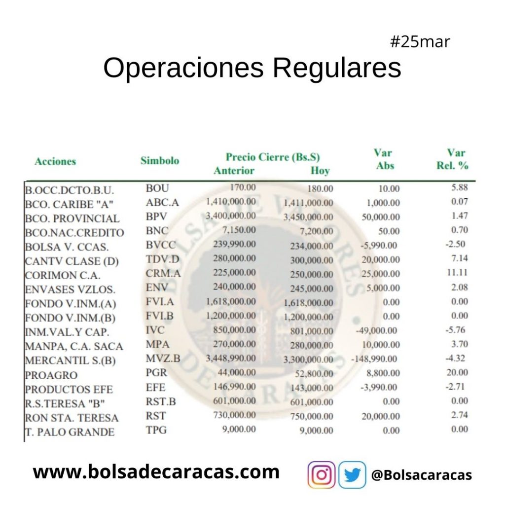 En el mercado a plazo se negociaron 547 mil 081 acciones por un monto de 135 mil 648 millones 296 mil 590 bolívares.