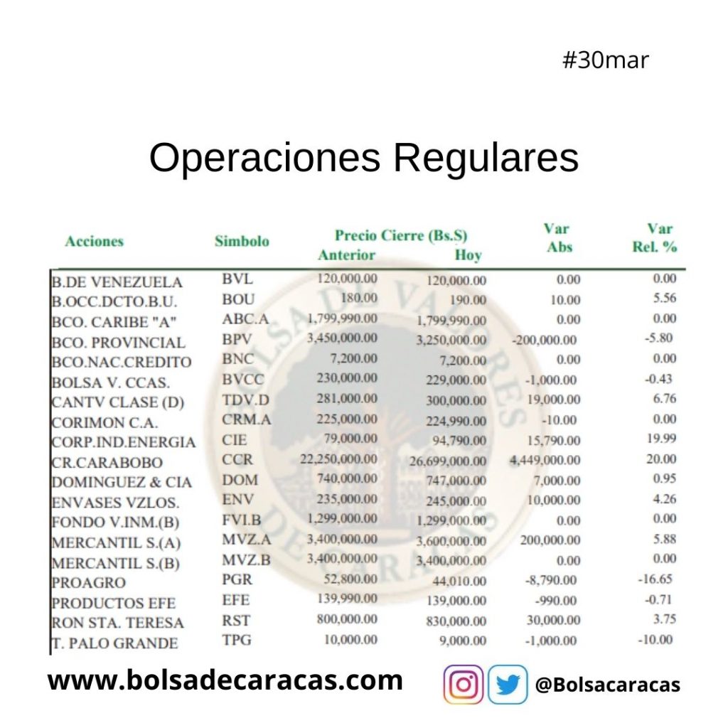 Se efectuaron 126 operaciones de compra/venta de acciones de las empresas inscritas en la pizarra de cotizaciones, en las cuales se transaron 622 mil 723 acciones por 12 mil 125 millones 488 mil 780 bolívares.