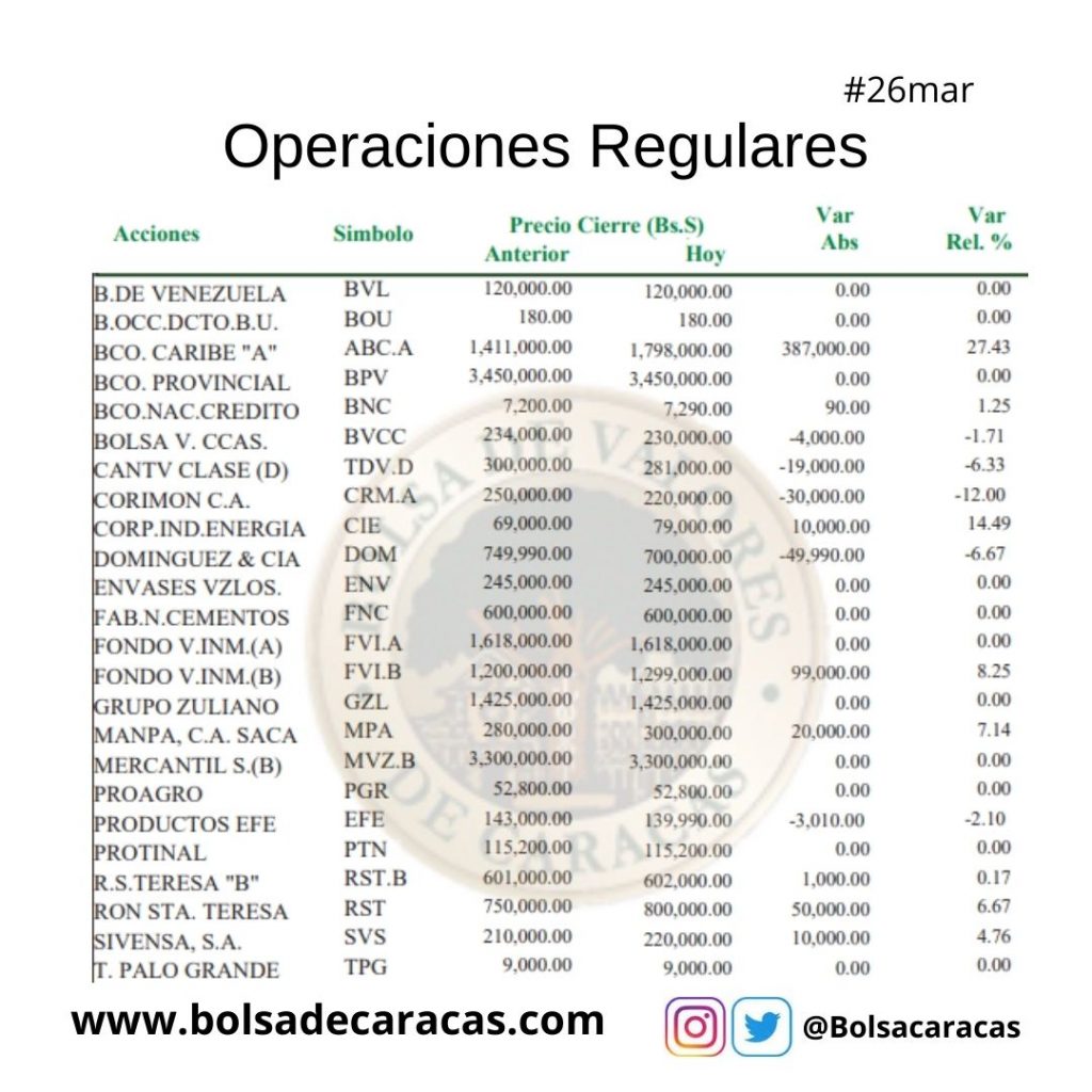 En el mercado a plazo se negociaron 51 mil 116 acciones por un monto de 14 mil 506 millones 381 mil 770 bolívares.