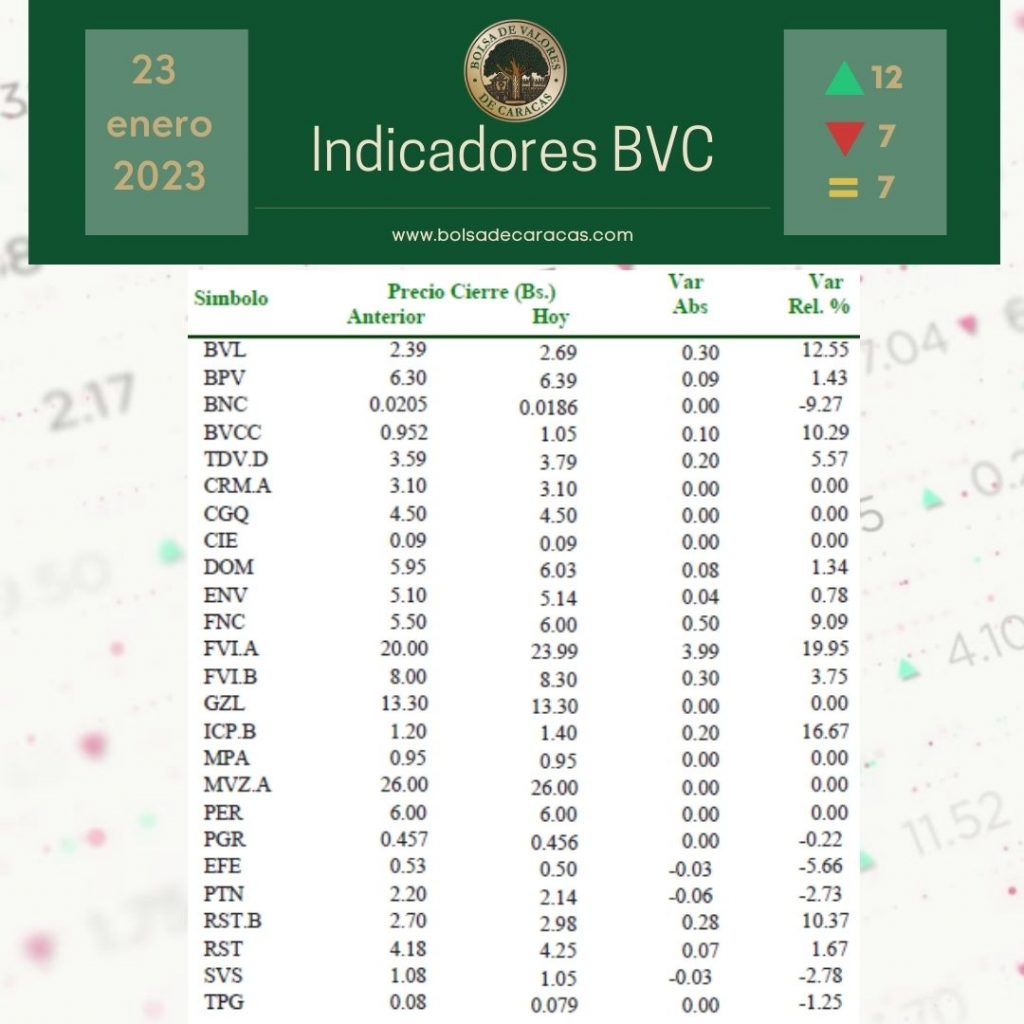 El índice principal de la Bolsa de Valores de Caracas, el IBC, culminó este lunes en 22.175,86, con una variación de 255,67 puntos (-1,14%), con respecto a la sesión anterior.