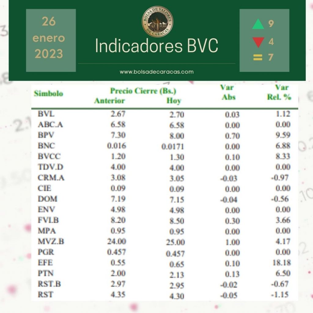 El índice principal de la Bolsa de Valores de Caracas, el IBC, culminó este jueves en 23.421,26, con una variación de 867,65 puntos (+3,85%), con respecto a la sesión anterior.