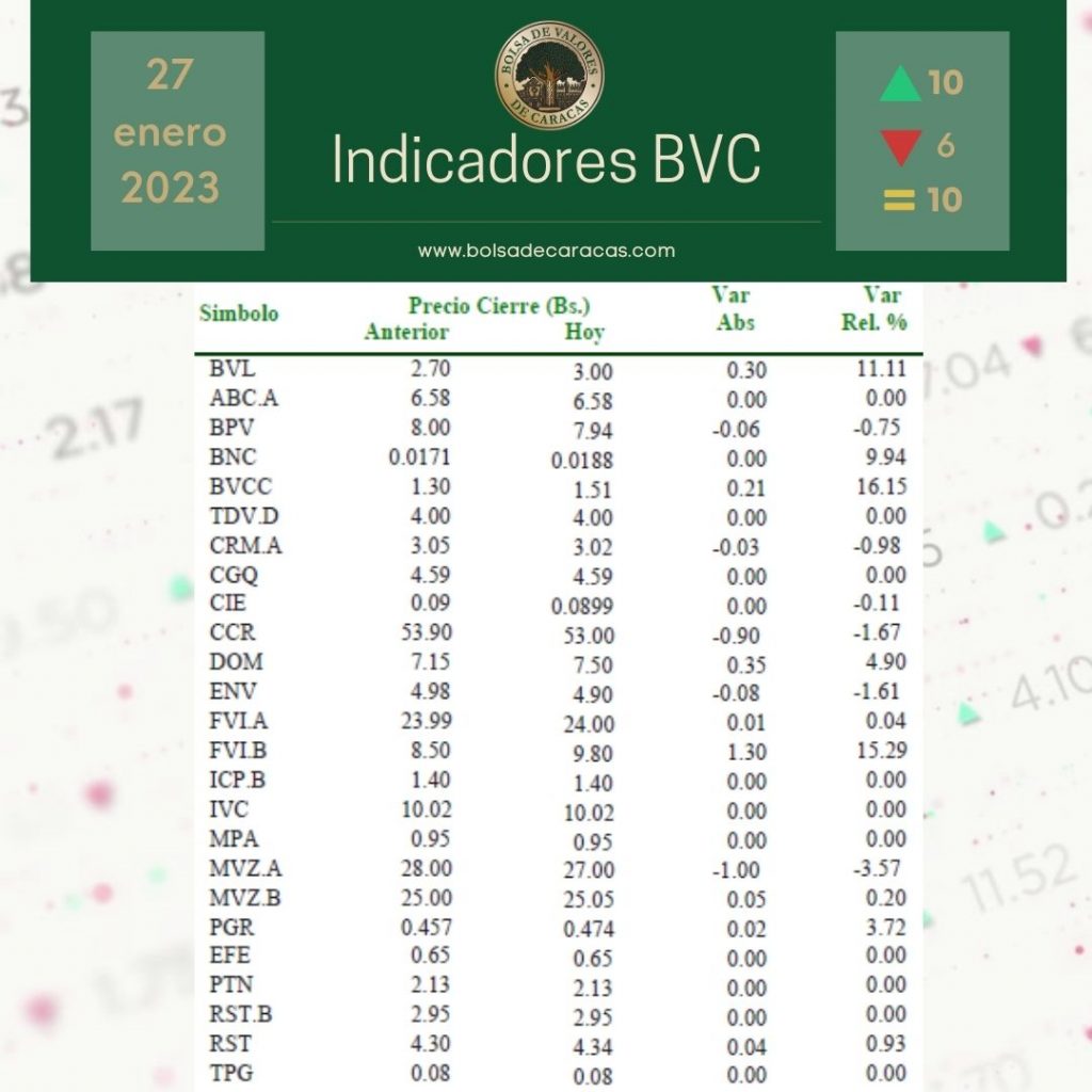 El índice principal de la Bolsa de Valores de Caracas, el IBC, culminó este viernes en 23.820,60, con una variación de 399,34 puntos (+1,71%), con respecto a la sesión anterior.