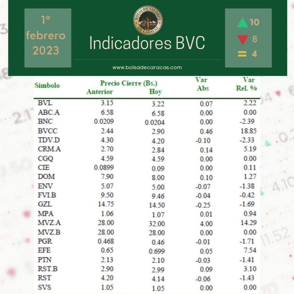 Se efectuaron 165 operaciones de compra/venta de acciones de las empresas inscritas en la pizarra de cotizaciones, en las cuales se transaron 741 mil 487 acciones por 495 mil 992 bolívares.