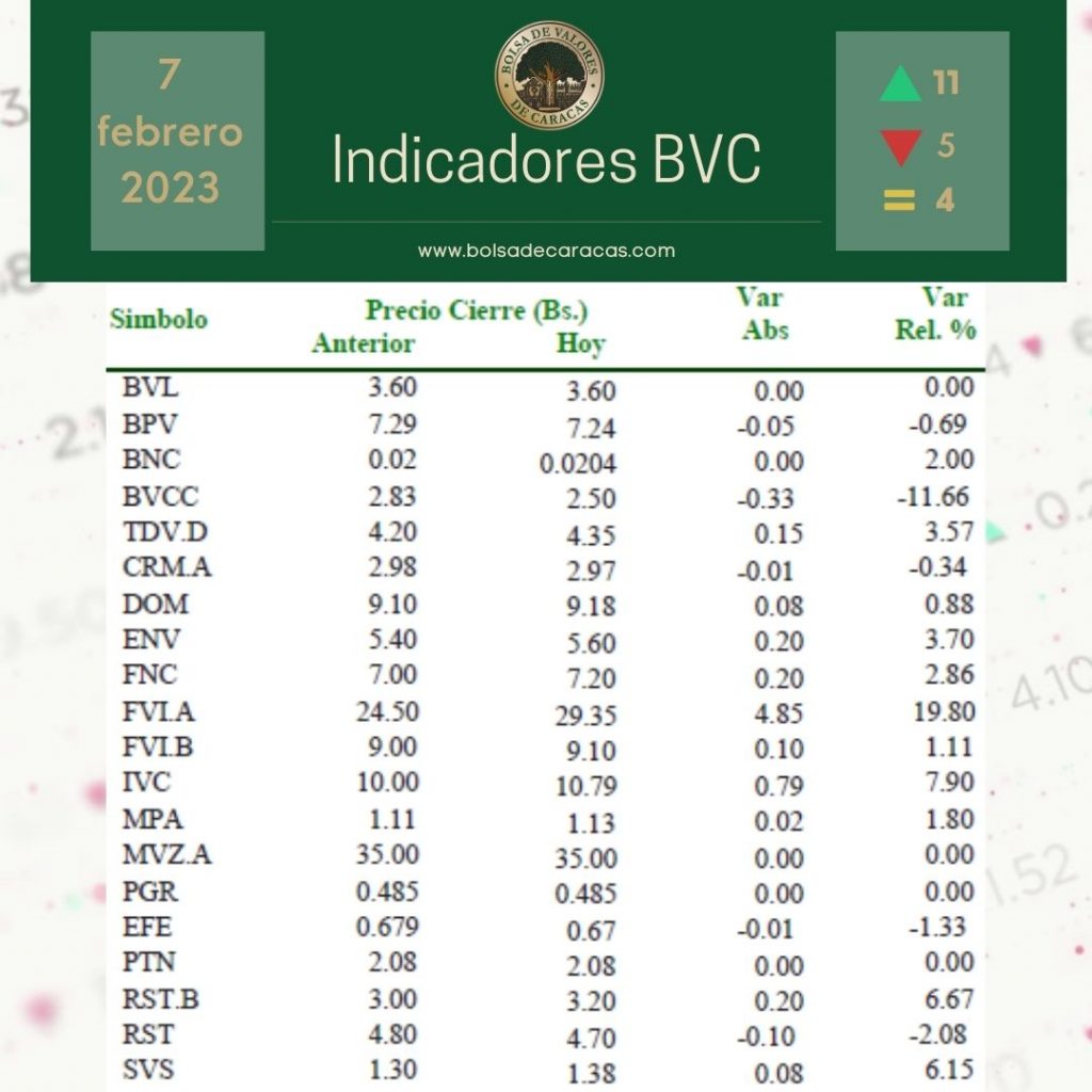 Se efectuaron 130 operaciones de compra/venta de acciones de las empresas inscritas en la pizarra de cotizaciones, en las cuales se transaron 102 millones 915 mil 291 acciones por 2 millones 320 mil 994 bolívares.