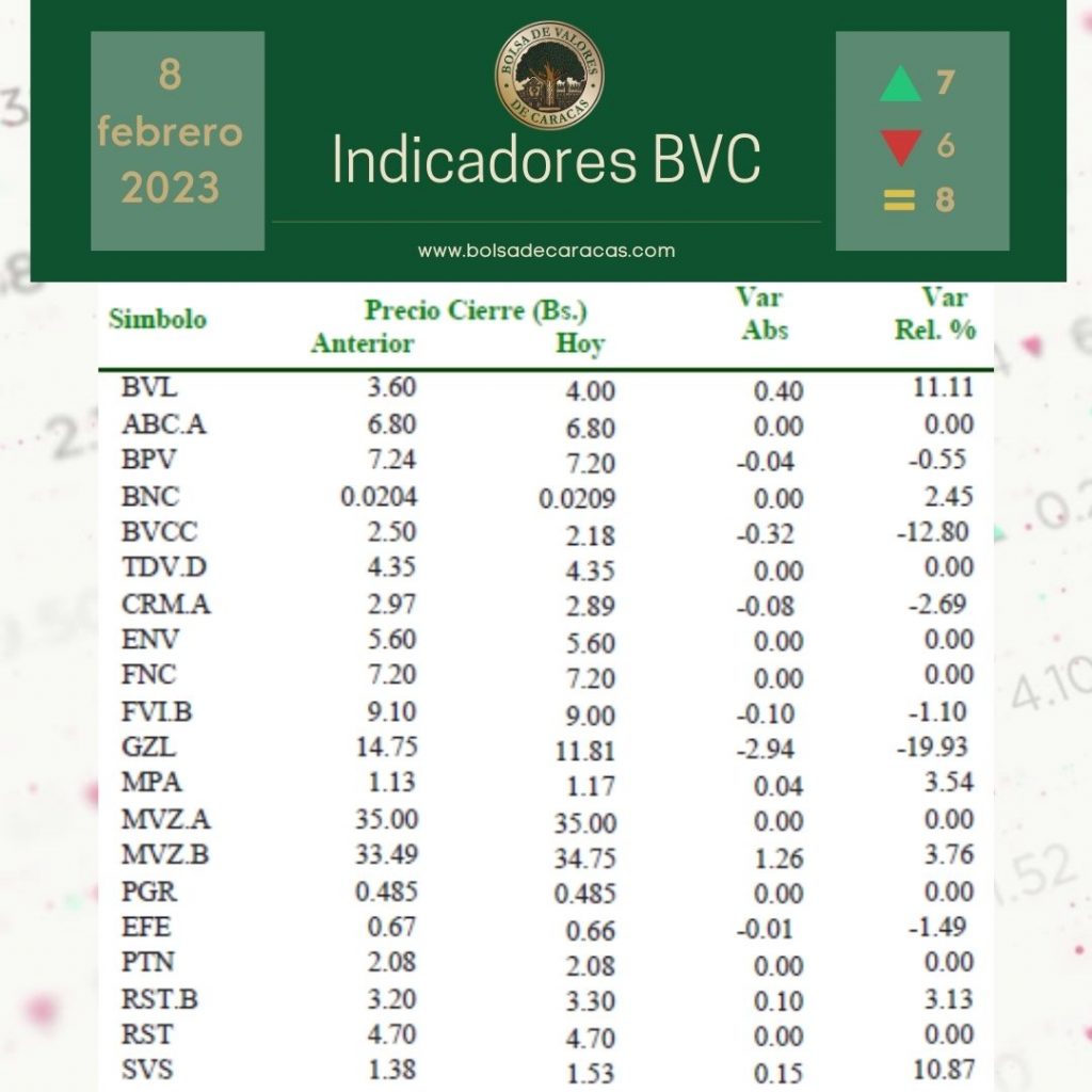 Se efectuaron 116 operaciones de compra/venta de acciones de las empresas inscritas en la pizarra de cotizaciones, en las cuales se transaron 903 mil 662 acciones por 363 mil 317 bolívares.