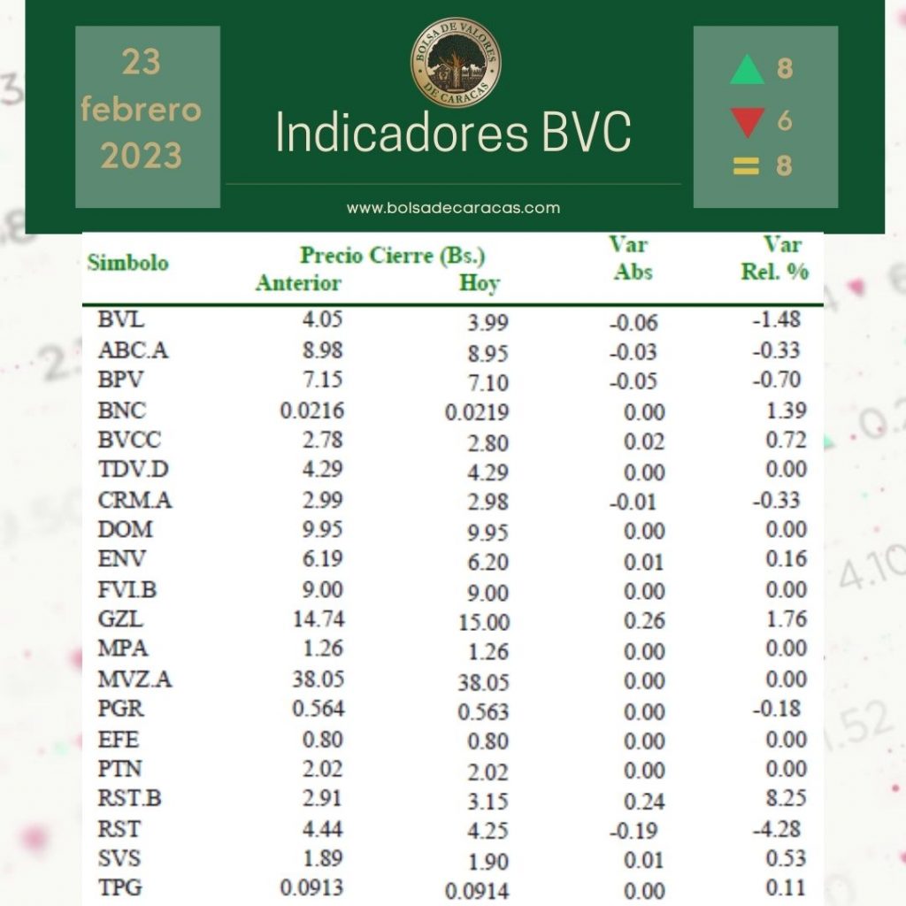 Se efectuaron 127 operaciones de compra/venta de acciones de las empresas inscritas en la pizarra de cotizaciones, en las cuales se transaron 11 millones 779 mil 875 acciones por 377 mil 528 bolívares.