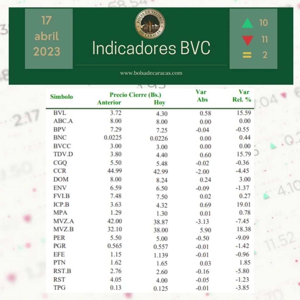 El índice principal de la Bolsa de Valores de Caracas, el IBC, culminó este lunes en 28.289,42 con una variación de 174,69 puntos (+0,62%), con respecto a la sesión anterior.