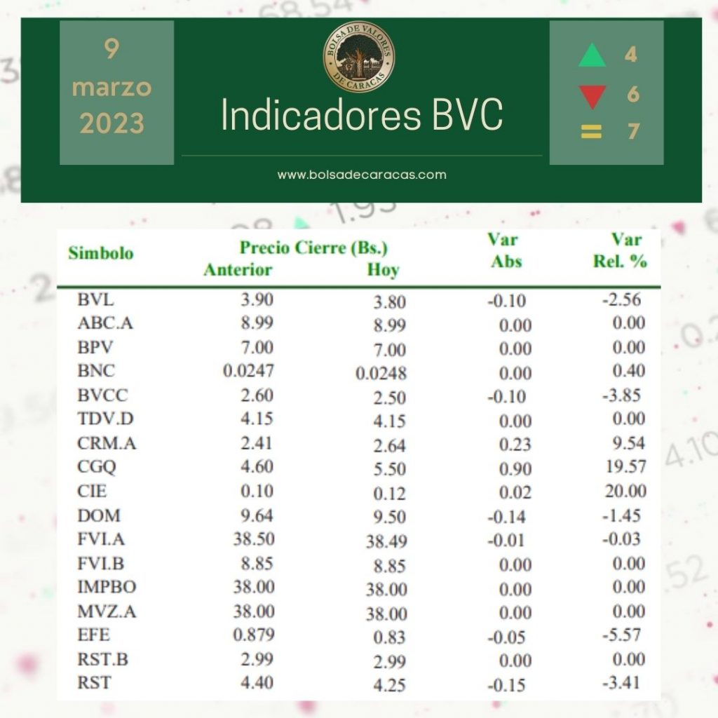 Se efectuaron 138 operaciones de compra/venta de acciones de las empresas inscritas en la pizarra de cotizaciones, en las cuales se transaron 2 millones 261 mil 143 acciones por 6 millones 408 mil 247 bolívares.
