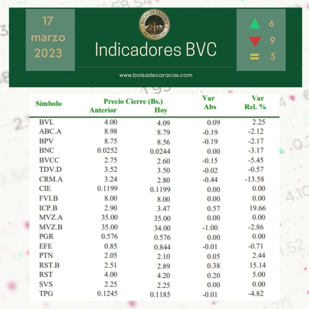 El índice principal de la Bolsa de Valores de Caracas, el IBC, culminó este viernes en 28.833,84 con una variación de 531,05 puntos (-1,81%), con respecto a la sesión anterior.