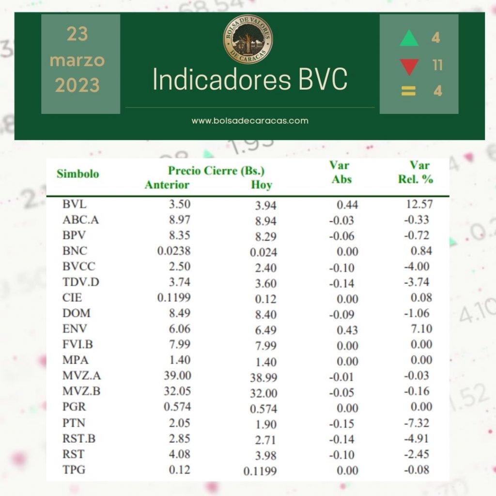 El índice principal de la Bolsa de Valores de Caracas, el IBC, culminó este jueves en 28.837,32 con una variación de 4,78 puntos (-0,02%), con respecto a la sesión anterior.