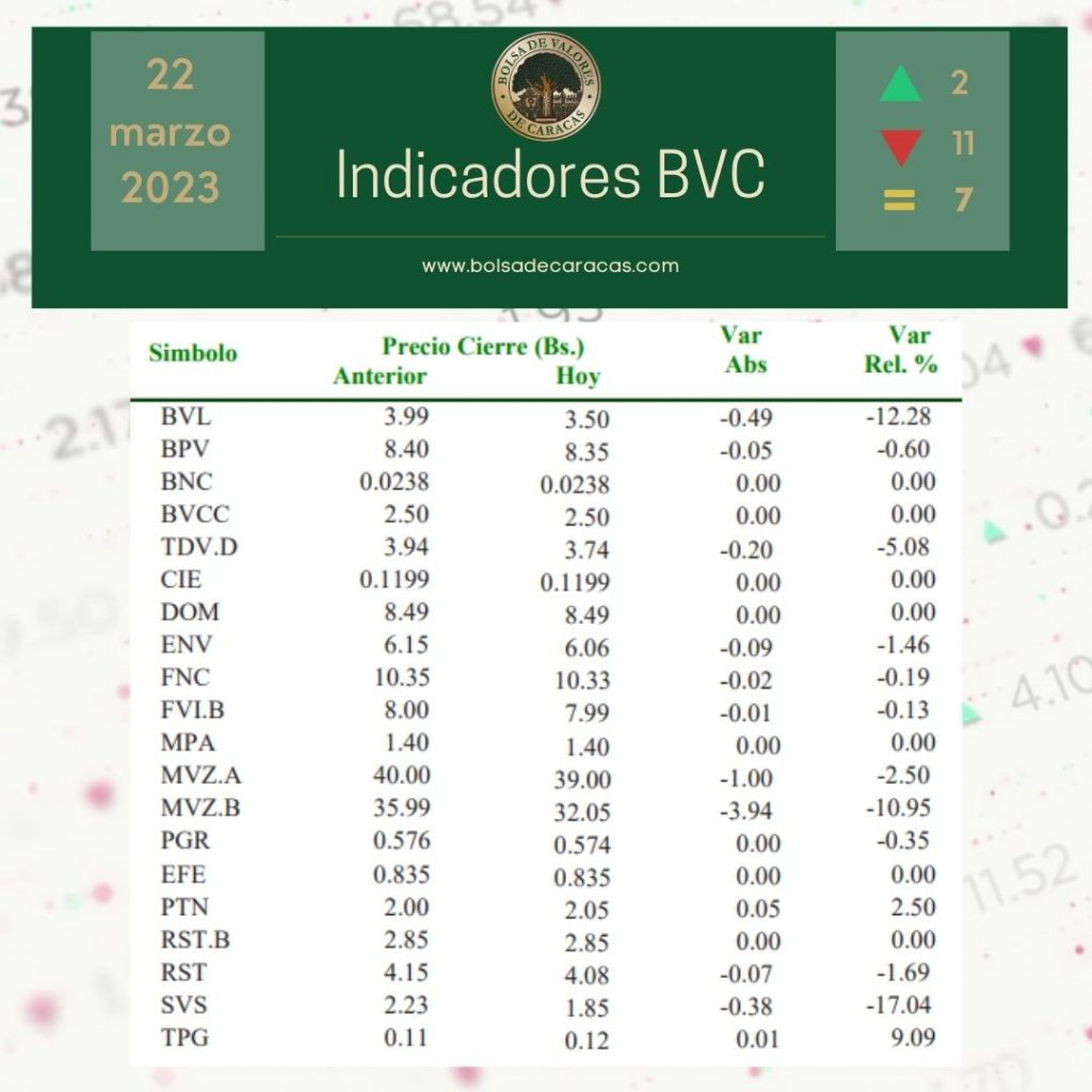 El índice principal de la Bolsa de Valores de Caracas, el IBC, culminó este miércoles en 28.842,10 con una variación de 637,06 puntos (-2,16%), con respecto a la sesión anterior.