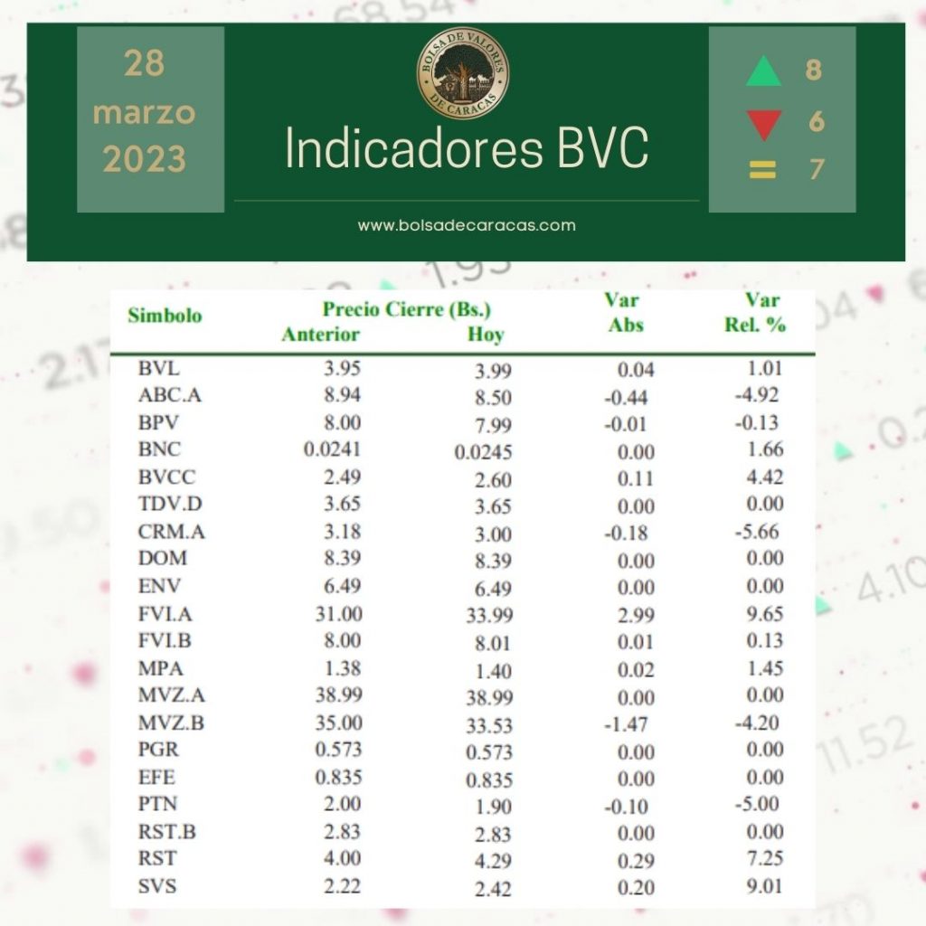 Se efectuaron 145 operaciones de compra/venta de acciones de las empresas inscritas en la pizarra de cotizaciones, en las cuales se transaron 1 millón 404 mil 877 acciones por 243 mil 590 bolívares.
