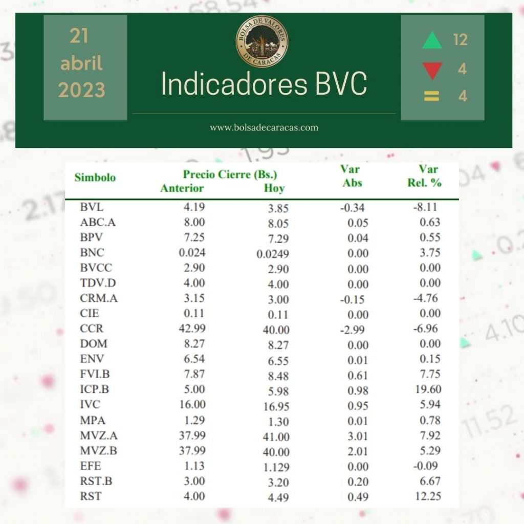 El índice principal de la Bolsa de Valores de Caracas, el IBC, culminó este viernes en 29.556,30 con una variación de 1.047,53 puntos (+3,67%), con respecto a la sesión anterior.