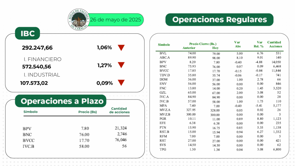 El índice principal de la Bolsa de Valores de Caracas, el IBC, culminó este lunes en 292.247,66 puntos con una variación de 3.125,31 puntos (-1,06%), con respecto a la sesión anterior.