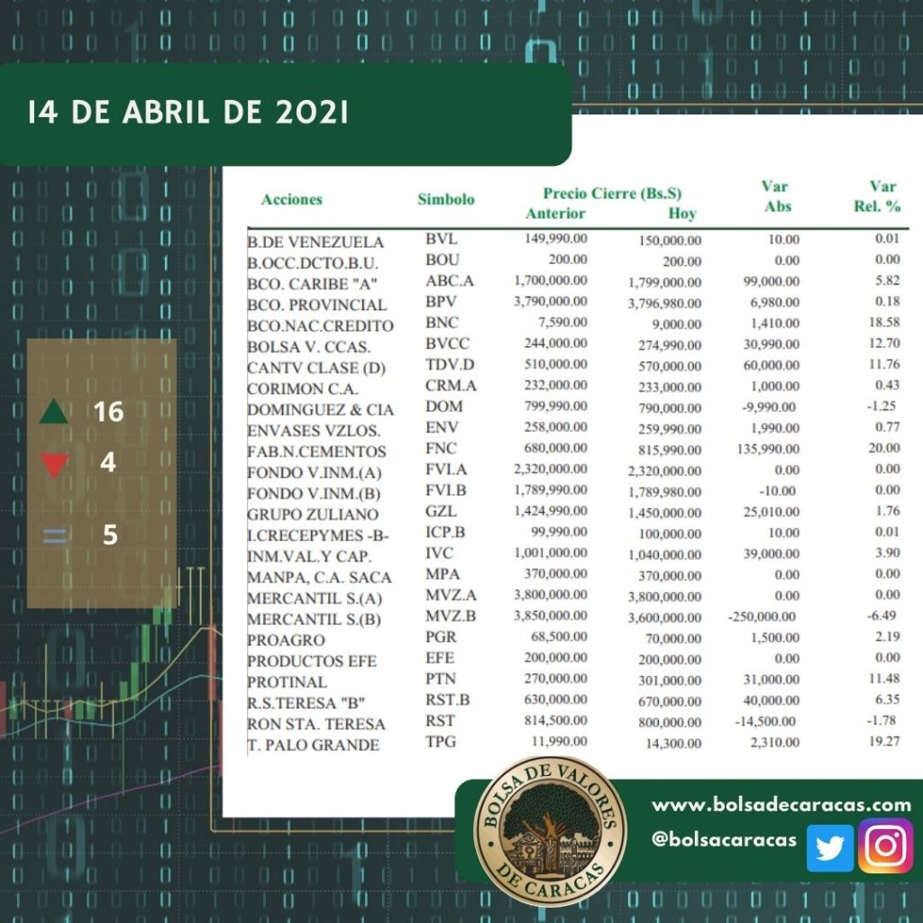 Se efectuaron 191 operaciones de compra/venta de acciones de las empresas inscritas en la pizarra de cotizaciones, en las cuales se transaron 227 mil 038 acciones por 51 mil 544 millones 581 mil 540 bolívares.