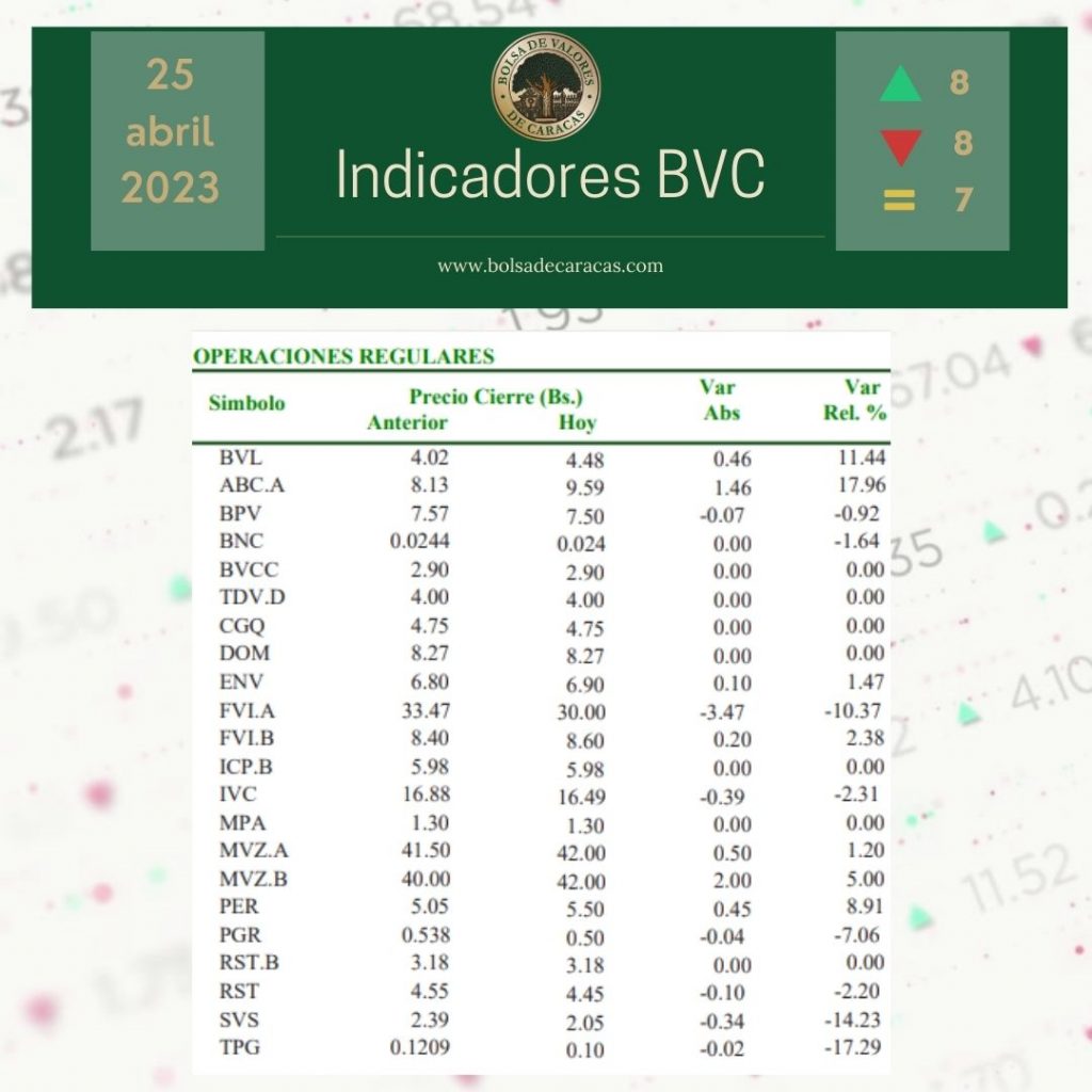 Se efectuaron 113 operaciones de compra/venta de acciones de las empresas inscritas en la pizarra de cotizaciones, en las cuales se transaron 181 mil 401 acciones por 122 mil 303 bolívares.