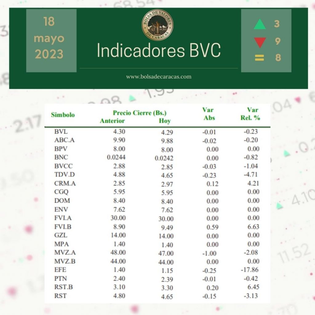 El índice principal de la Bolsa de Valores de Caracas, el IBC, culminó este jueves en 31.785,42 puntos con una variación de 222,07 puntos (-0,69%), con respecto a la sesión anterior.