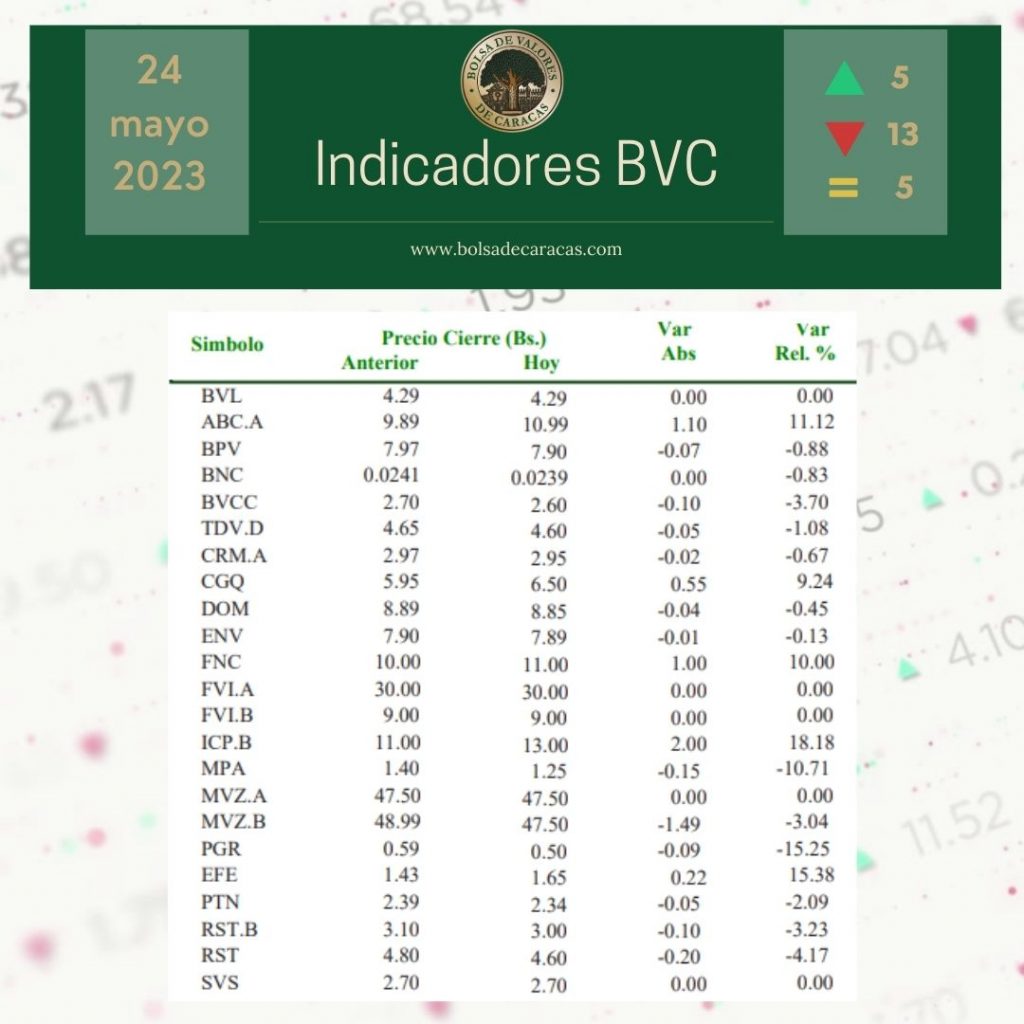 El índice principal de la Bolsa de Valores de Caracas, el IBC, culminó este miércoles en 32.105,18 puntos con una variación de 226,03 puntos (-0,70%), con respecto a la sesión anterior.