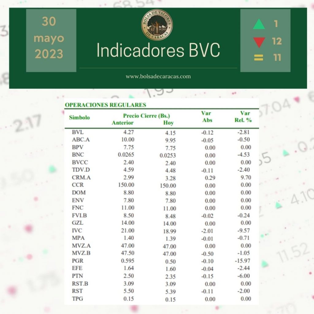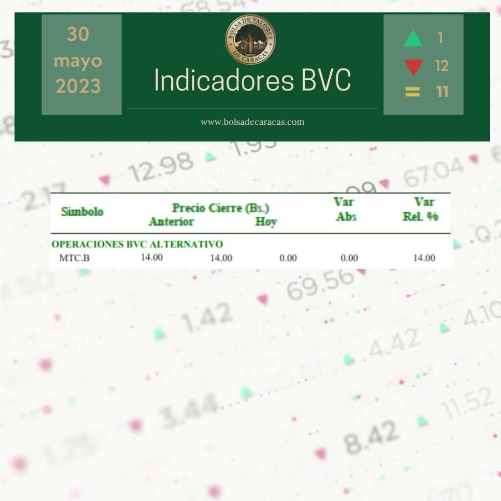 El índice principal de la Bolsa de Valores de Caracas, el IBC, culminó este martes en 32.545,17 puntos con una variación de 337,65 puntos (-1,03%), con respecto a la sesión anterior.
