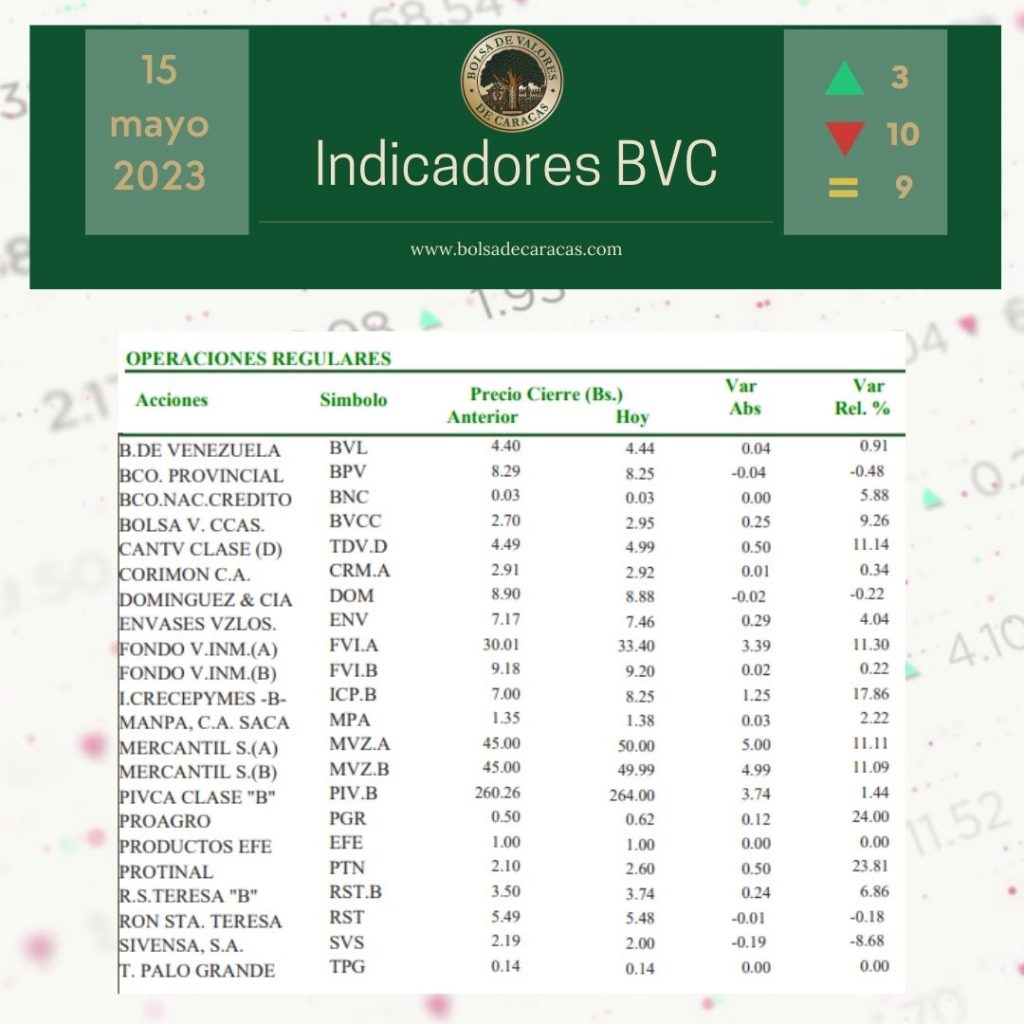 El índice principal de la Bolsa de Valores de Caracas, el IBC, culminó este lunes en 33.033,13 puntos con una variación de 238,92 puntos (-0,72%), con respecto a la sesión anterior.