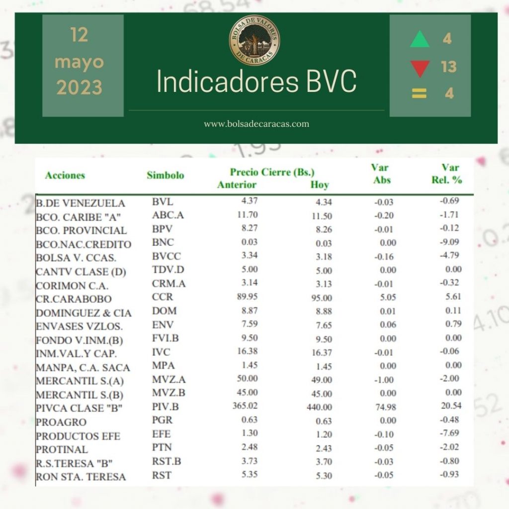 El índice principal de la Bolsa de Valores de Caracas, el IBC, culminó este viernes en 33.272,05 puntos con una variación de 836,51 puntos (-2,45%), con respecto a la sesión anterior.