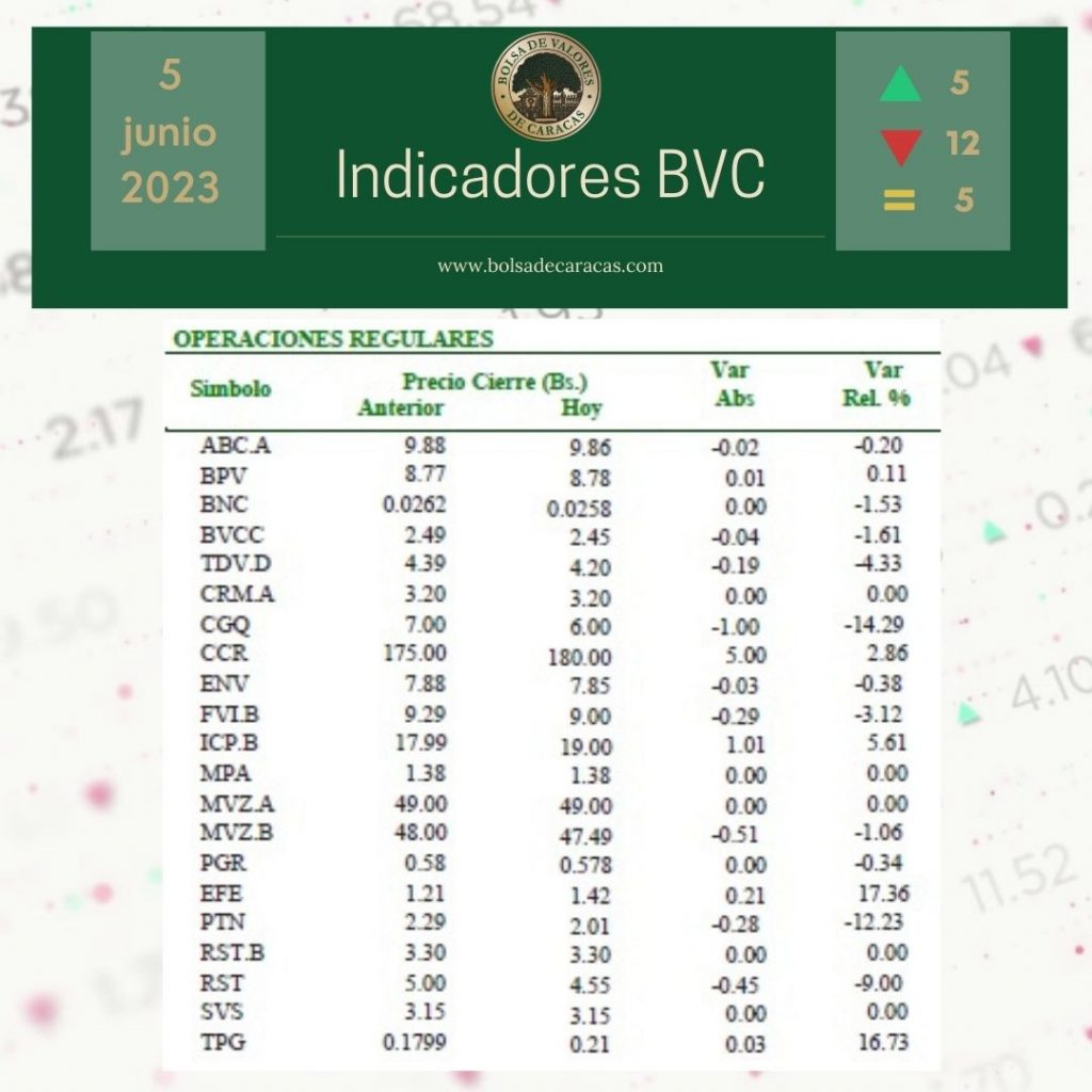 Se efectuaron 111 operaciones de compra/venta de acciones de las empresas inscritas en la pizarra de cotizaciones, en las cuales se transaron 1 millón 484 mil 476 acciones por 74 mil 875 bolívares.