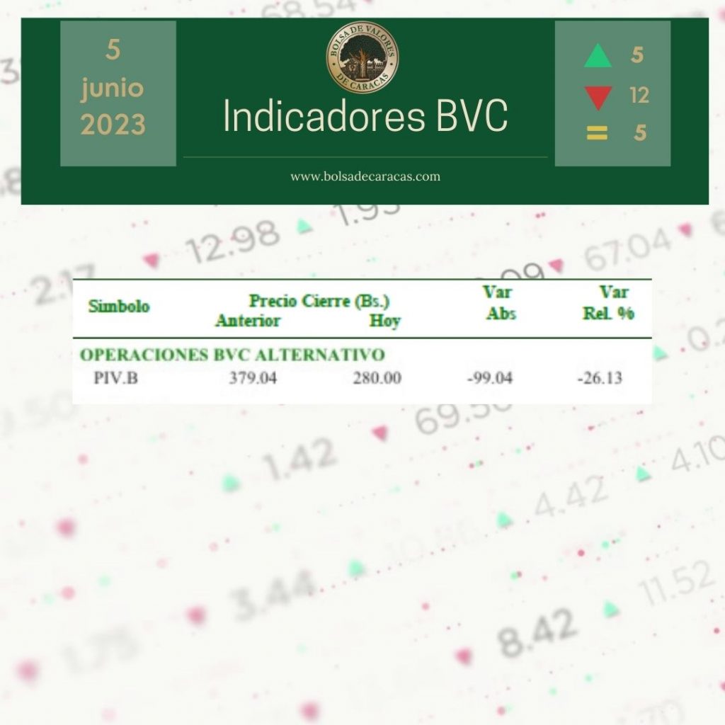 El índice principal de la Bolsa de Valores de Caracas, el IBC, culminó este lunes en 33.282,75 puntos con una variación de 446,57 puntos (-1,32%), con respecto a la sesión anterior.