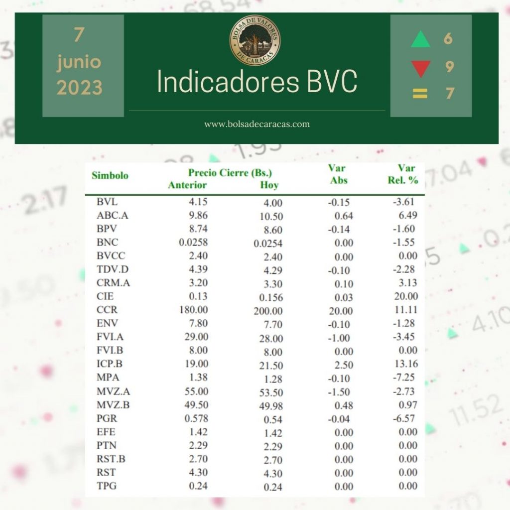 El índice principal de la Bolsa de Valores de Caracas, el IBC, culminó este miércoles en 33.653,78 puntos con una variación de 271,41 puntos (-0,80%), con respecto a la sesión anterior.