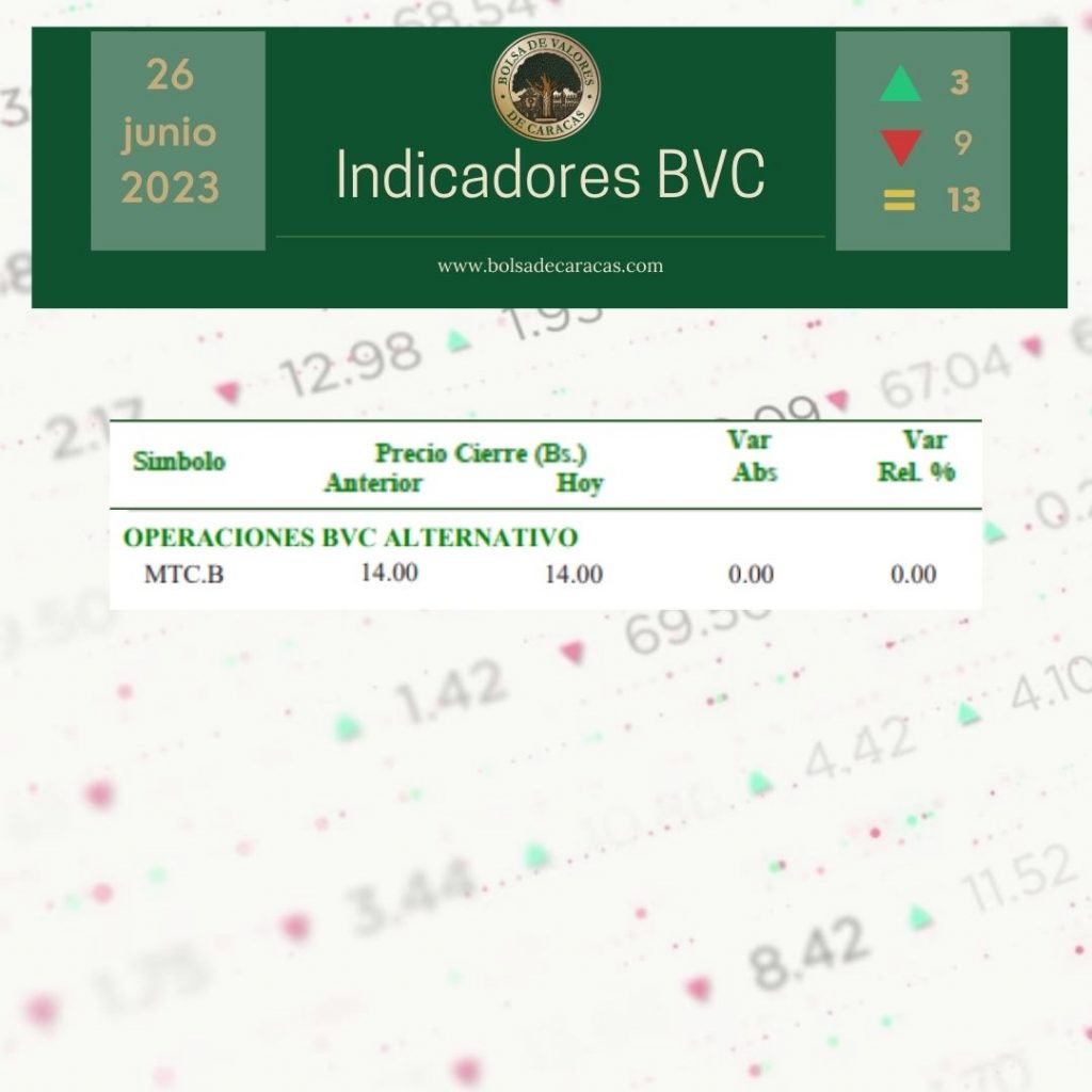 El índice principal de la Bolsa de Valores de Caracas, el IBC, culminó este lunes en 33.819,93 puntos con una variación de 251,84 puntos (-0,74%), con respecto a la sesión anterior.
