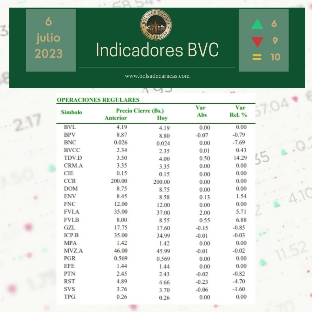 Se efectuaron 109 operaciones de compra/venta de acciones de las empresas inscritas en la pizarra de cotizaciones, en las cuales se transaron 1 millón 132 mil 598 acciones por 136 mil 716 bolívares.