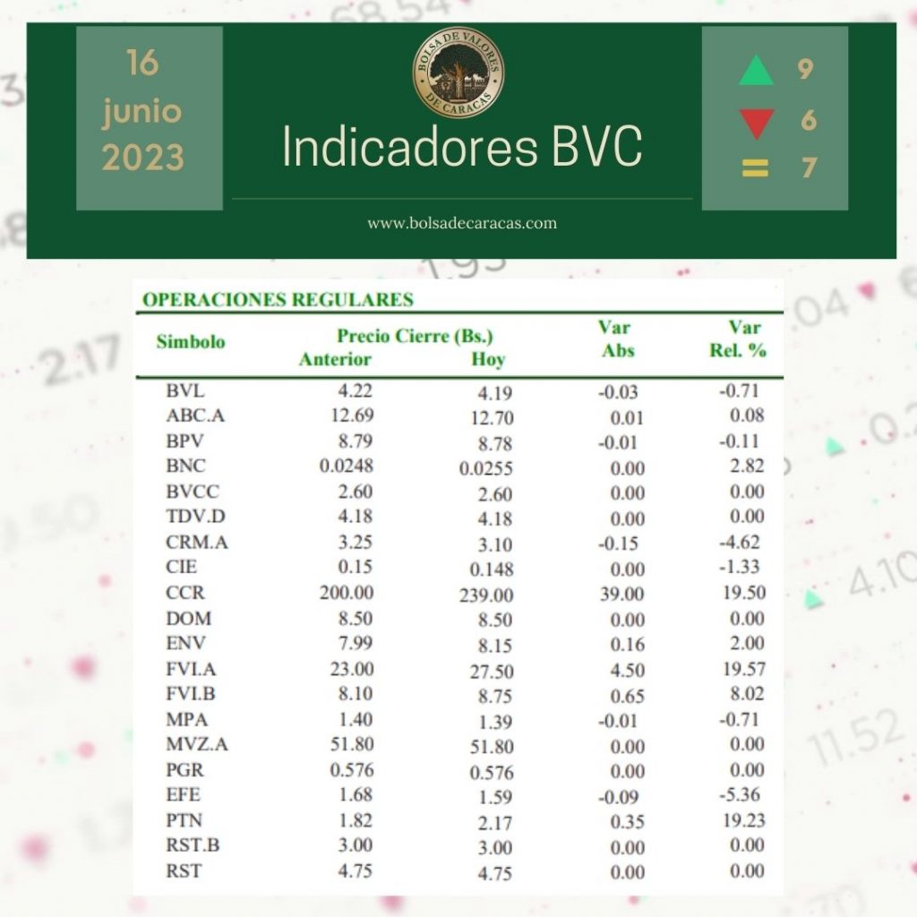 El índice principal de la Bolsa de Valores de Caracas, el IBC, culminó este viernes en 34.583,45 puntos con una variación de 235,34 puntos (+0,69%), con respecto a la sesión anterior.