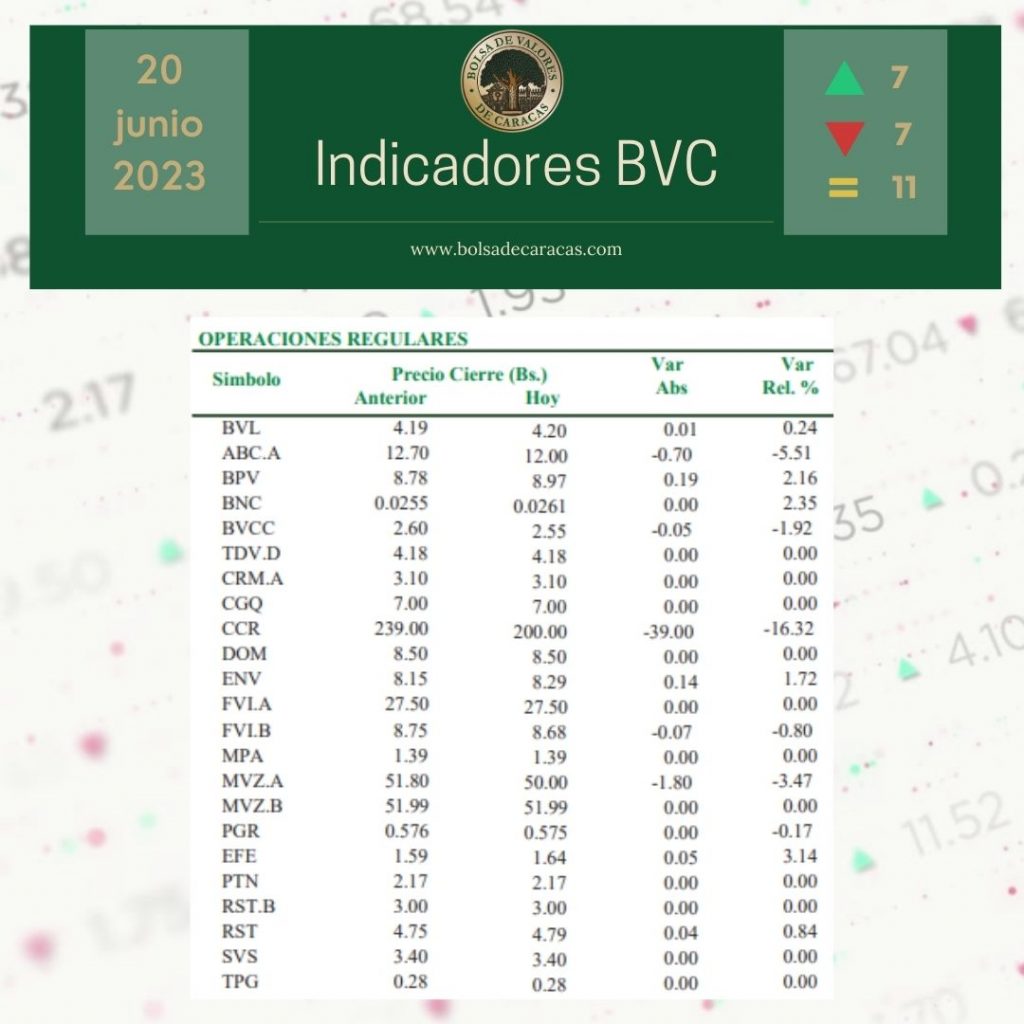 El índice principal de la Bolsa de Valores de Caracas, el IBC, culminó este martes en 34.587,88 puntos con una variación de 4,43 puntos (+0,01%), con respecto a la sesión anterior.