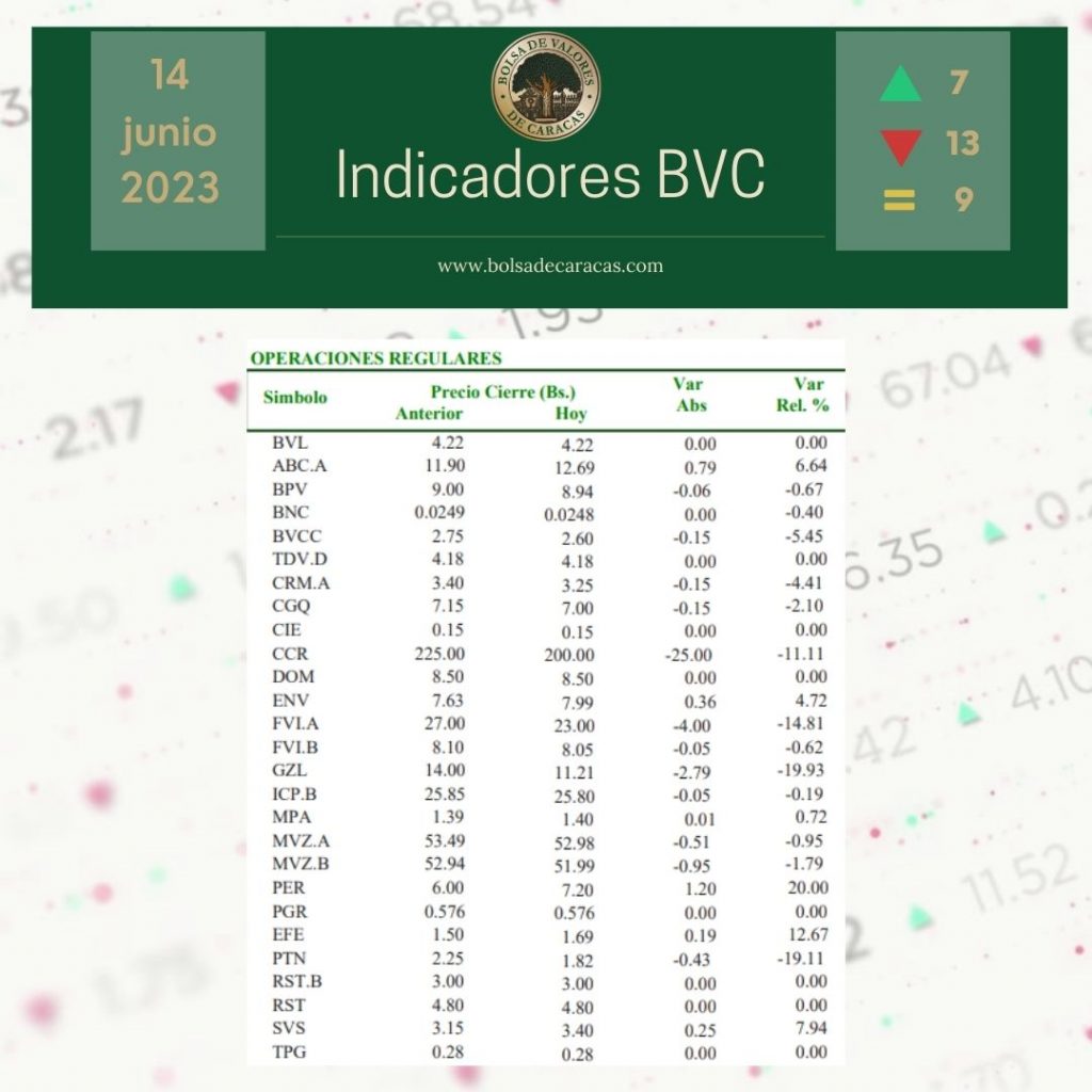 El índice principal de la Bolsa de Valores de Caracas, el IBC, culminó este miércoles en 34.627,50 puntos con una variación de 70,00 puntos (-0,20%), con respecto a la sesión anterior.