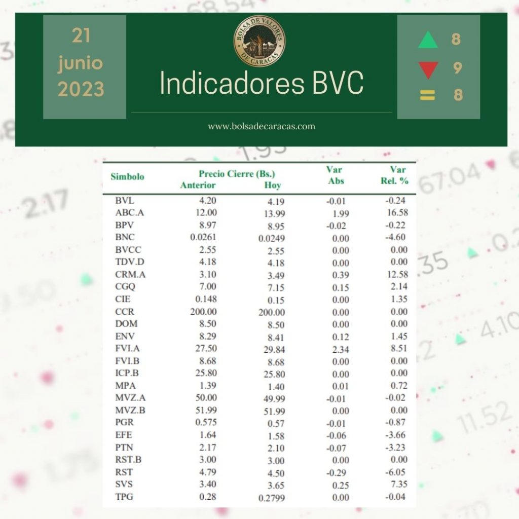 El índice principal de la Bolsa de Valores de Caracas, el IBC, culminó este miércoles en 34.669,22 puntos con una variación de 81,34 puntos (+0,24%), con respecto a la sesión anterior.