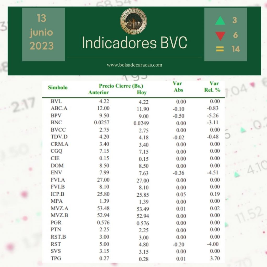 El índice principal de la Bolsa de Valores de Caracas, el IBC, culminó este martes en 34.697,50 puntos con una variación de 802,86 puntos (-2,26%), con respecto a la sesión anterior.