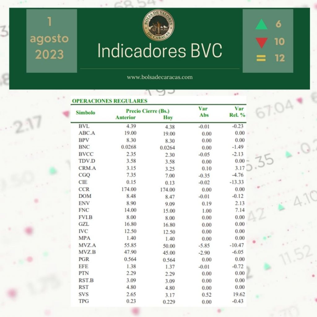 El índice principal de la Bolsa de Valores de Caracas, el IBC, culminó este martes en 34.894,95 puntos con una variación de 888,40 puntos (-2,48%), con respecto a la sesión anterior.