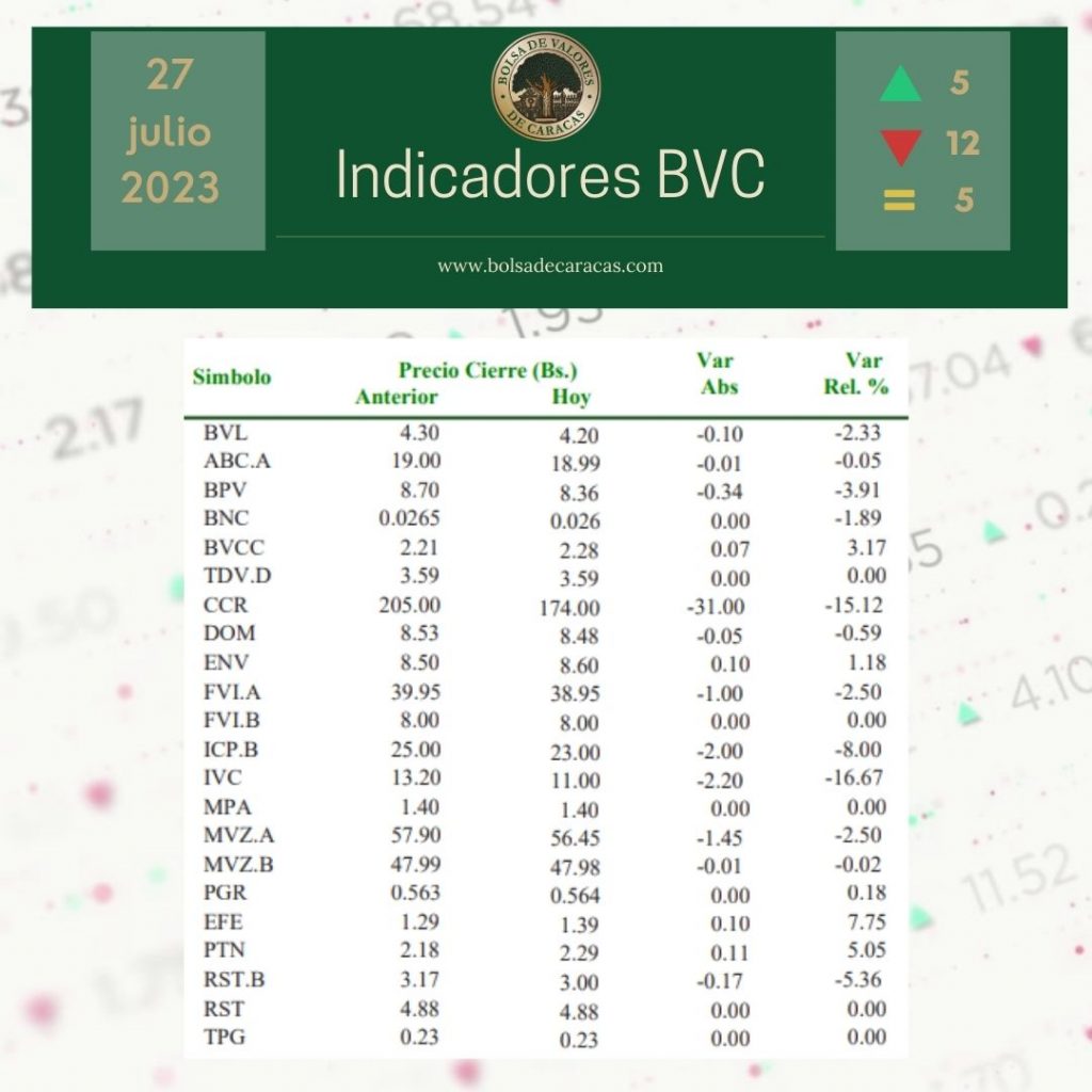 El índice principal de la Bolsa de Valores de Caracas, el IBC, culminó este jueves en 35.582,23 puntos con una variación de 530,23 puntos (-1,47%), con respecto a la sesión anterior.