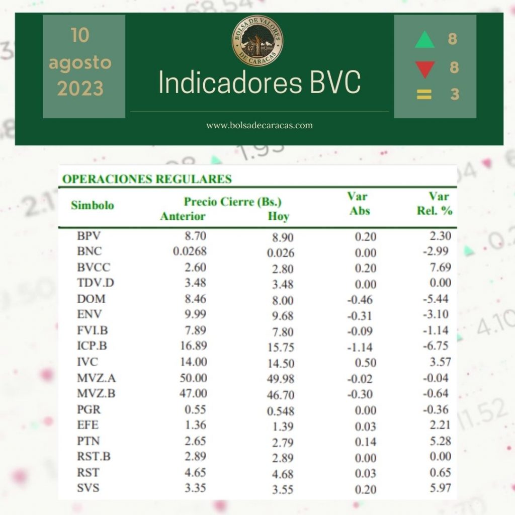 Se efectuaron 85 operaciones de compra/venta de acciones de las empresas inscritas en la pizarra de cotizaciones, en las cuales se transaron 1 millón 382 mil 058 acciones por 178 mil 175 bolívares.