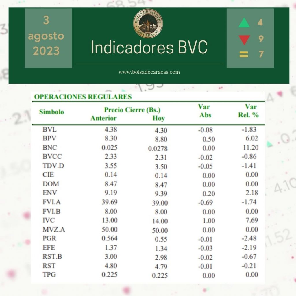 El índice principal de la Bolsa de Valores de Caracas, el IBC, culminó este jueves en 36.021,36 puntos con una variación de 1.108,93 puntos (+3,18%), con respecto a la sesión anterior.