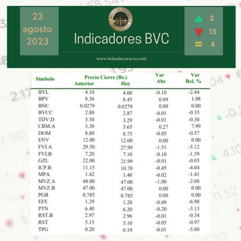 El índice principal de la Bolsa de Valores de Caracas, el IBC, culminó este miércoles en 36.883,43 puntos con una variación de 20,16 puntos (-0,05%), con respecto a la sesión anterior.