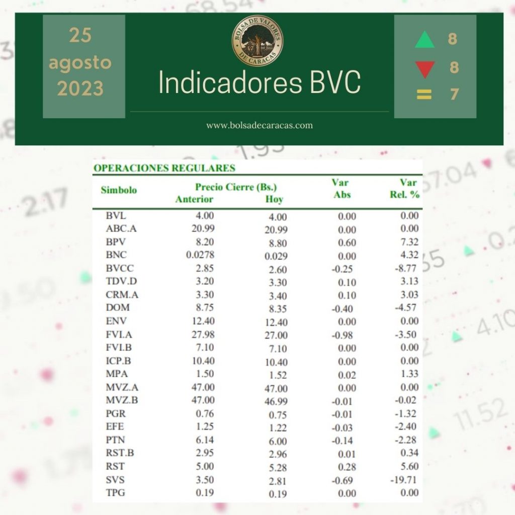 El índice principal de la Bolsa de Valores de Caracas, el IBC, culminó este viernes en 37.379,87 puntos con una variación de 779,91 puntos (+2,13%), con respecto a la sesión anterior.