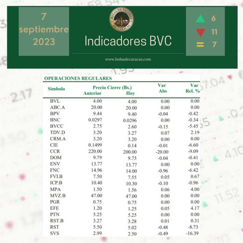 Se efectuaron 105 operaciones de compra/venta de acciones de las empresas inscritas en la pizarra de cotizaciones, en las cuales se transaron 2 millones 372 mil 623 acciones por 4 millones 497 mil 482 bolívares.