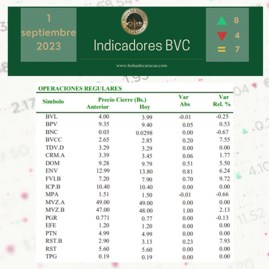Se efectuaron 185 operaciones de compra/venta de acciones de las empresas inscritas en la pizarra de cotizaciones, en las cuales se transaron 1 millón 819 mil 367 acciones por 279 mil 151 bolívares.