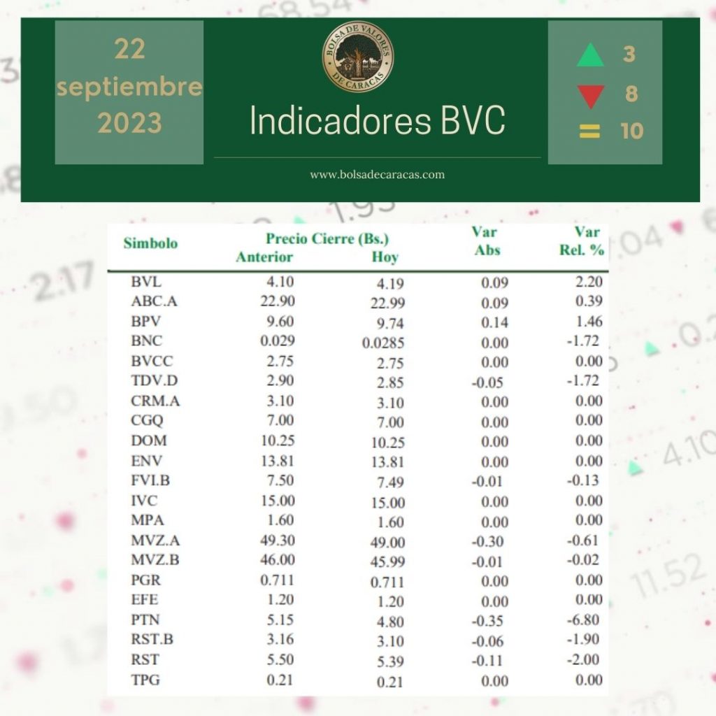Se efectuaron 124 operaciones de compra/venta de acciones de las empresas inscritas en la pizarra de cotizaciones, en las cuales se transaron 36 millones 184 mil 357 acciones por 1 millón 263 mil 862 bolívares.